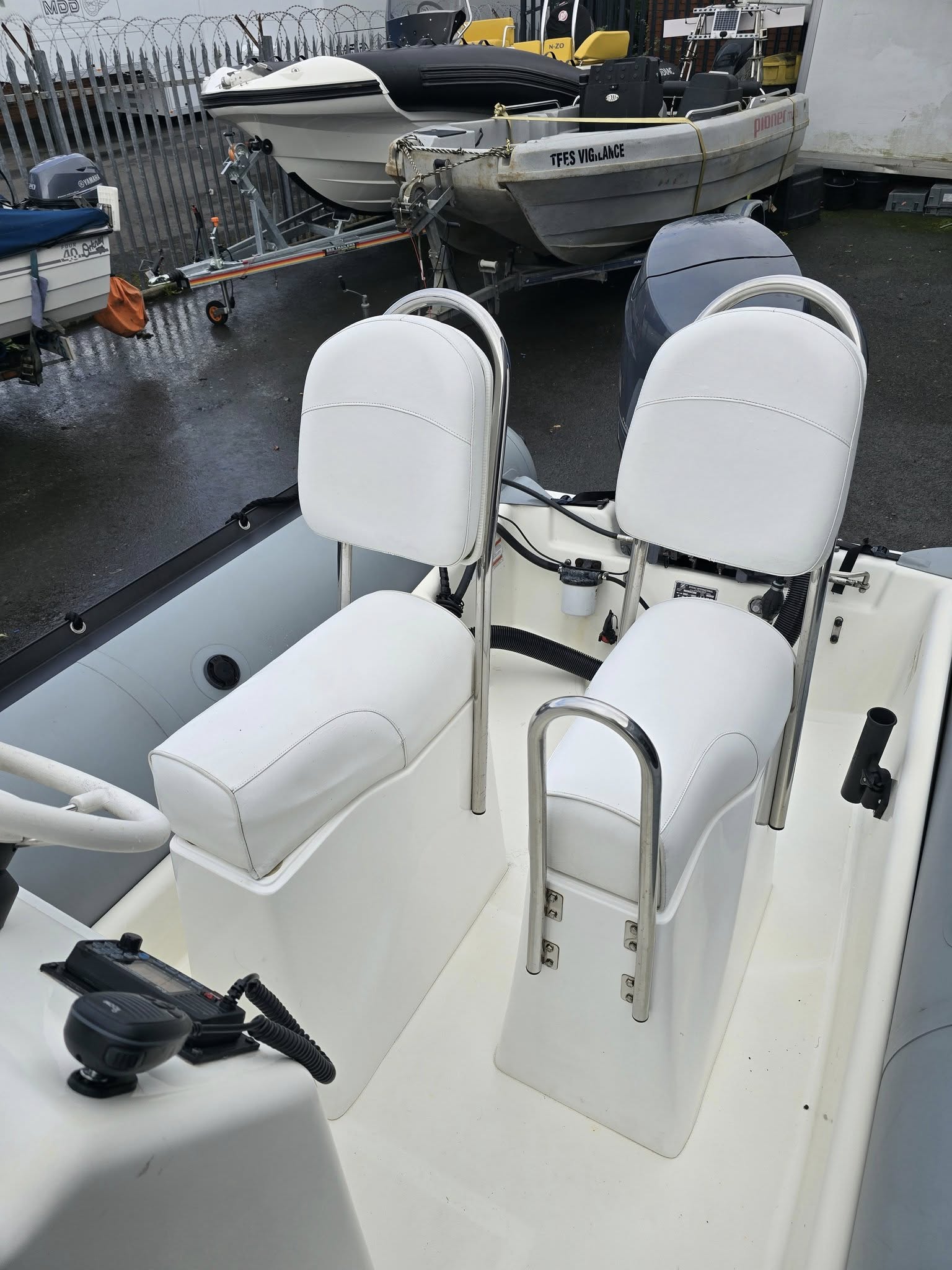 Brand new SBS R2-1300EL trailer, new ICOM VHF Radio, Raymarine Dragonfly, built-in fuel tank, twin jockey seats in a preferred side-by-side position, forward seat with storage under, large bow locker, self-draining deck, engine cover and full cover.